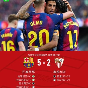 北京时间3月15日西班牙足球甲级联赛 联赛 第28轮,巴塞罗那主场对阵塞维利亚。上半场坎塞洛造点,拉菲尼亚打进勺子点球,...