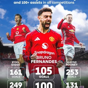 英超第30轮,曼联主场对阵维拉,下半场布鲁诺-费尔南德斯送出两次助攻,至此,布鲁诺-费尔南德斯曼联生涯进球和助攻数均已破...