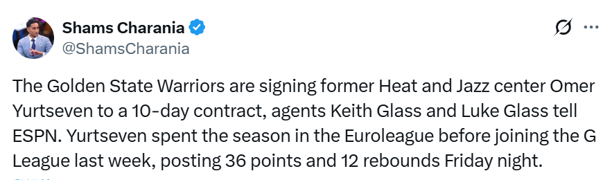 北京时间3月15日,据名记Shams报道,勇士将以一份10天短合同签下自由球员中锋尤尔特塞文,经纪人证实了这一消息。