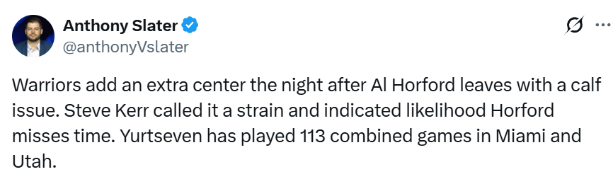 老将中锋霍福德因右小腿受伤,预计将缺席多场比赛。据勇士队记Slater透露,39岁的霍福德被确诊为比目鱼肌(小腿)拉伤,塞斯-库里则是左内收肌拉伤。除波斯特出战成疑外,上述所有球员都将缺席周一对阵尼克斯的比赛。
